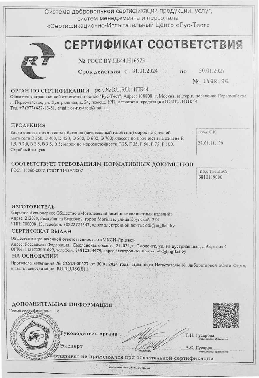 Марка прочности газобетона указывает на его способность выдерживать нагрузки. Чем выше марка, тем прочнее материал. Газобетон Могилевский КСИ D500 имеет достаточную прочность для использования в различных строительных конструкциях.